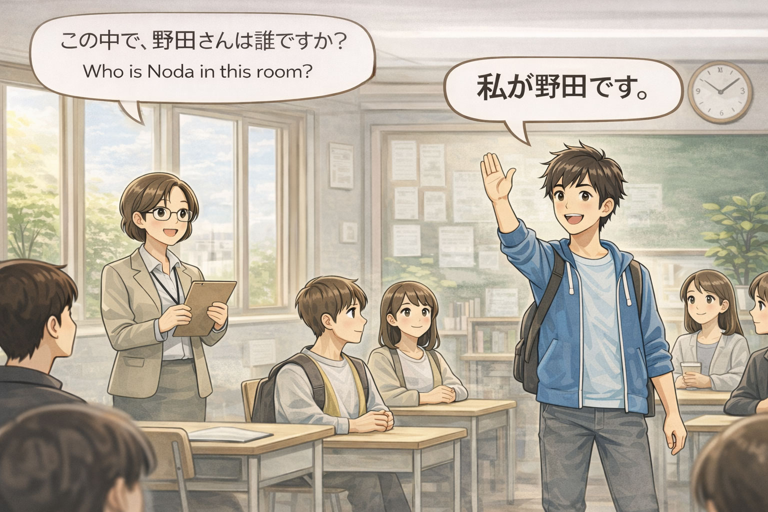 - They ask: “この中で、野田さんは誰ですか?(Who is Noda in this room?) ”